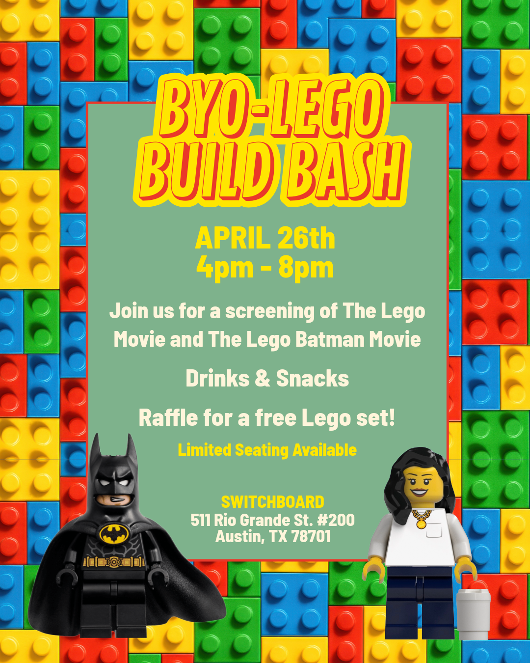 Get ready for a playful night of creativity and nostalgia at our BYO Lego Build Bash—bring your own set, enjoy beer/wine/non-alcoholic beverages and movie theatre snacks, and kick back for a fun double feature screening of The Lego Movie and Lego Batman while you build your masterpiece!